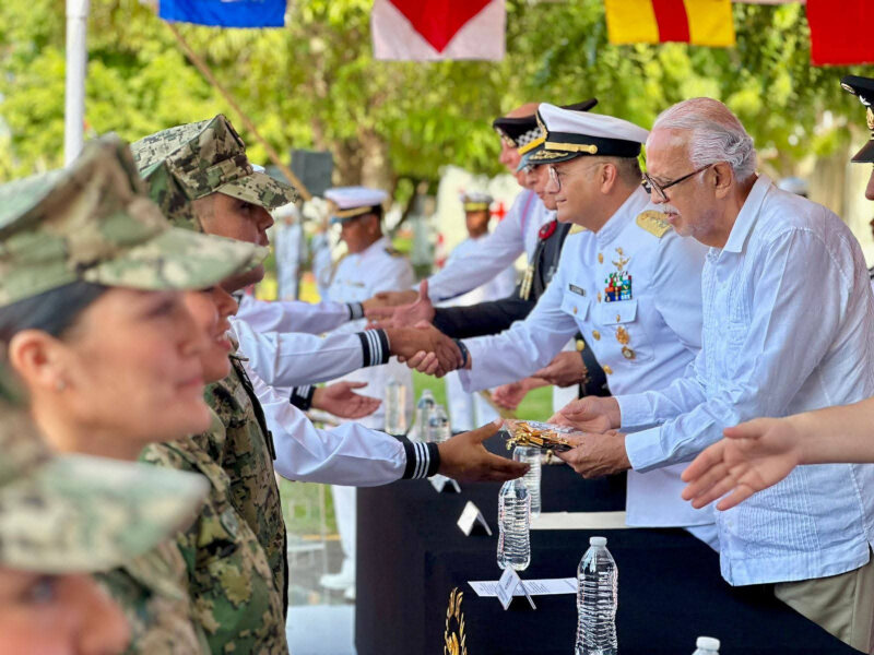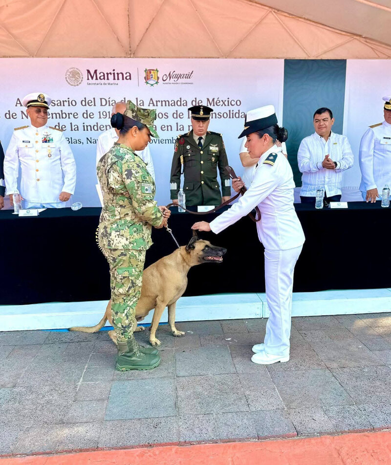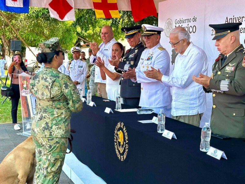 De igual forma, se realizó la entrega de ascensos al personal de la Secretaría de Marina Armada de México, en reconocimiento a su profesionalismo, disciplina y entrega por entre 10 y 25 años de servicio. Asimismo, el gobernador entregó un reconocimiento al elemento canino Galo, quien, tras 7 años y 10 meses de servicio, se jubila; recibió esta distinción la teniente de fragata del Servicio de Trabajo Social Naval, Ángela Gabriela Torres.