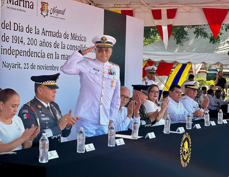 A temprana hora, en la 10ª Zona Naval, el mandatario estatal, junto a su esposa, la presidenta del Sistema DIF Nayarit, doctora Beatriz Estrada Martínez, asistió al evento por el Aniversario del Día de la Armada de México, donde reconoció la labor de mujeres y hombres que salvaguardan la soberanía nacional y contribuyen a la seguridad de los nayaritas.