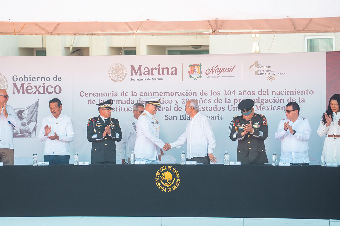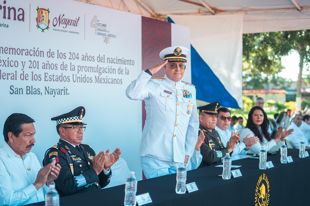 El gobernador de Nayarit, Miguel Ángel Navarro Quintero, asistió a la ceremonia de la conmemoración de los 204 años del nacimiento de la Armada de México y 201 años de la promulgación de la Constitución Federal de los Estados Unidos Mexicanos, realizada en las instalaciones de la Décima Zona Naval, en el municipio de San Blas.