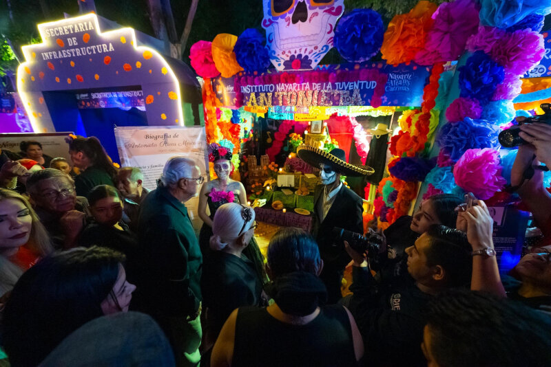 Posteriormente, el mandatario estatal y la presidenta del DIF inauguraron la exposición de altares de muertos, donde cada uno estuvo dedicado a mujeres nayaritas o mexicanas, reflejando la riqueza cultural y espiritual de las instituciones de Nayarit, destacando los elementos tradicionales que preservan una de las festividades más representativas de México.
