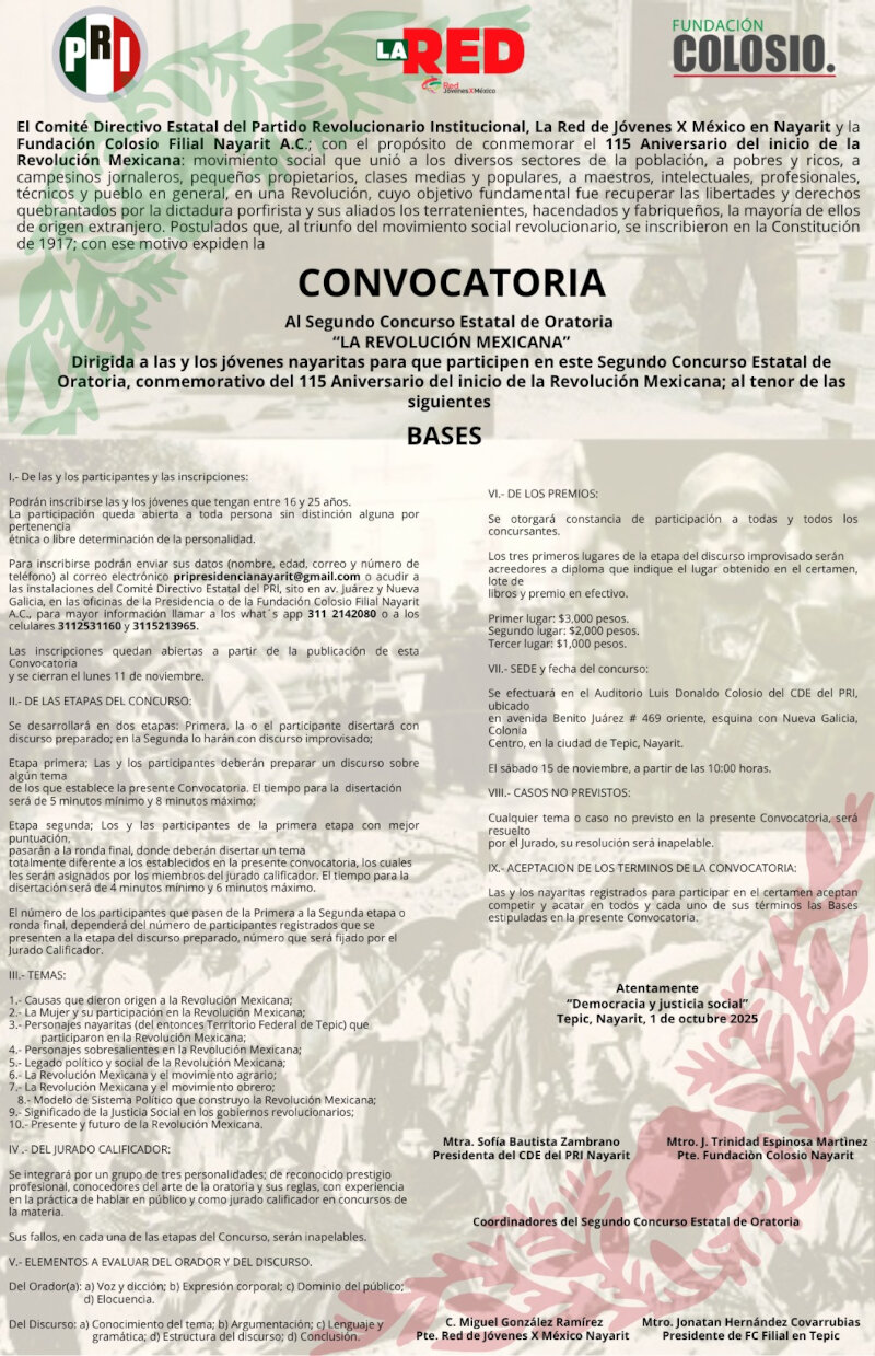 El Comité Directivo Estatal del Partido Revolucionario Institucional, la Red de Jóvenes X México y la Fundación Colosio filial Nayarit, A. C., convocan al segundo concurso estatal de oratoria denominado La Revolución Mexicana, con motivo del 115 aniversario de la gesta heroica.