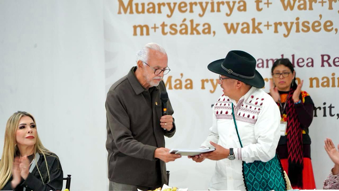 El gobernador de Nayarit, Miguel Ángel Navarro Quintero, junto al director general del Instituto Nacional de los Pueblos Indígenas (INPI), Adelfo Regino Montes, asistió a la Asamblea Regional de Seguimiento del Plan de Justicia de los Pueblos Náayeri, Wixárika, Mexikan y O’dam del Estado de Nayarit, en Tepic.