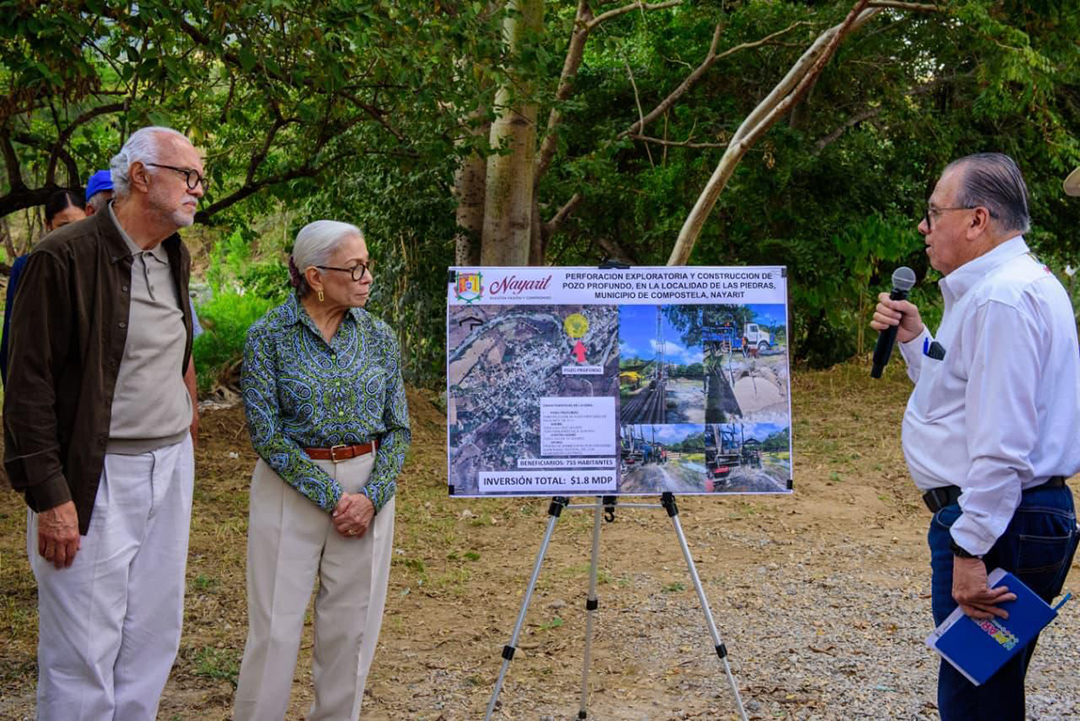 El gobernador del estado, Miguel Ángel Navarro Quintero, acompañado de su esposa, la presidenta del Sistema DIF Nayarit, doctora Beatriz Estrada Martínez, supervisó los trabajos de perforación exploratoria y la construcción de un pozo profundo en la localidad de Las Piedras, municipio de Compostela.