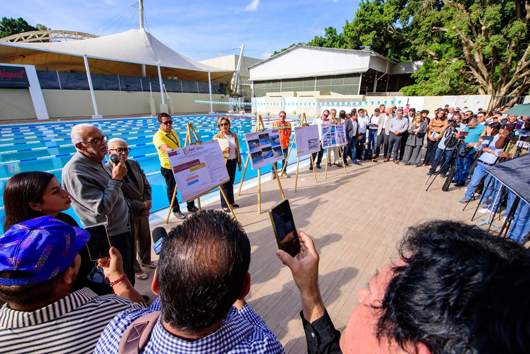 El gobernador del estado, Miguel Ángel Navarro Quintero, acompañado de su esposa, la presidenta del Sistema DIF Nayarit, doctora Beatriz Estrada Martínez, realizó una visita de supervisión a la obra de la alberca olímpica del parque La Loma, un proyecto estratégico que fortalece la infraestructura deportiva de la capital y amplía las oportunidades para la práctica del deporte en Nayarit.