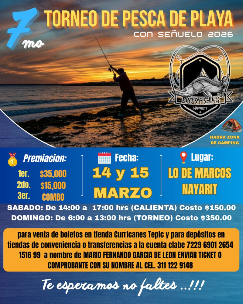 Ya salió la convocatoria del Séptimo Torneo de Pesca de Playa con señuelo 2026, organizado por Bros Fishing. La cita será el 14 y 15 de marzo en las bellas playas de Lo de Marcos en el turístico municipio de Bahía de Banderas. Según avisó Mario Fernando García de León, la premiación será para los tres primeros lugares.