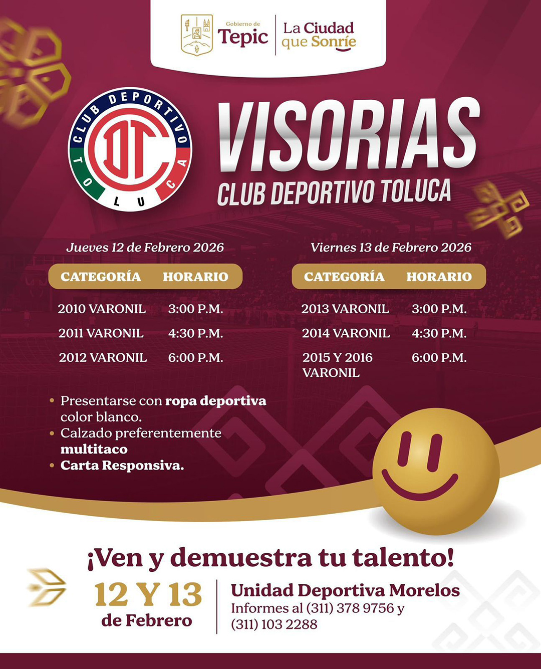 HABRÁ VISORÍAS DEL BICAMPEÓN TOLUCA EN TEPIC EL JUEVES 12 Y VIERNES 13 DE FEBRERO EN LA CANCHA DE LA UNIDAD DEPORTIVA MORELOS