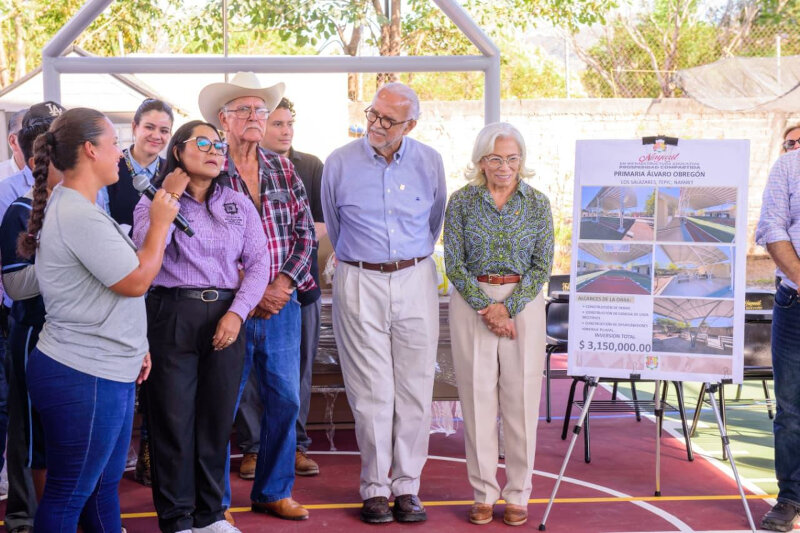 Este domingo, el gobernador del estado, Miguel Ángel Navarro Quintero, y su esposa, la doctora Beatriz Estrada Martínez, presidenta del Sistema DIF Nayarit, entregaron obras que por más de cien años no habían llegado a la primaria Álvaro Obregón, de la localidad de Los Salazares, municipio de Tepic, la cual pasó de contar con dos aulas a convertirse en una escuela completa.