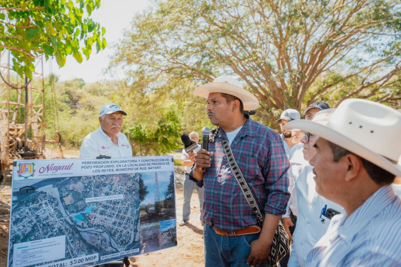 El gobernador del estado, Miguel Ángel Navarro Quintero, inició una gira de trabajo en Presidio de los Reyes, municipio de Ruiz, acompañado de su esposa, la doctora Beatriz Estrada Martínez, presidenta del Sistema DIF Nayarit, donde constató los avances en la perforación exploratoria y construcción de un pozo profundo para garantizar el acceso al agua en la localidad.