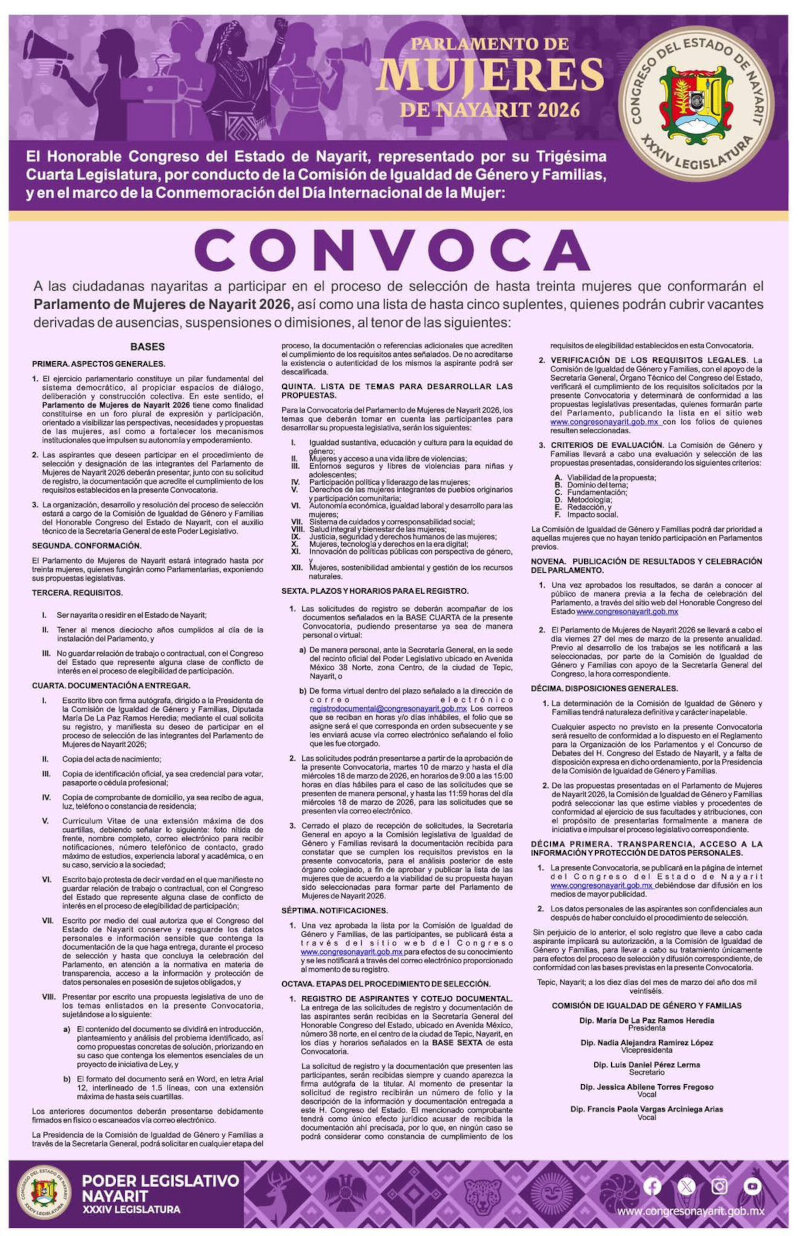 El Honorable Congreso del Estado de Nayarit, a través de la Comisión de Igualdad de Género y Familias de la XXXIV Legislatura, emitió la convocatoria para seleccionar a las integrantes del Parlamento de Mujeres de Nayarit 2026, esto en el marco de la conmemoración del Día Internacional de la Mujer.