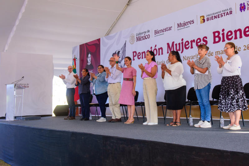 En el municipio de Santa María del Oro, la presidenta de México, Claudia Sheinbaum Pardo, encabezó la entrega de tarjetas de la Pensión Mujeres Bienestar durante su gira de trabajo por Nayarit, acompañada por el gobernador del estado, Miguel Ángel Navarro Quintero.