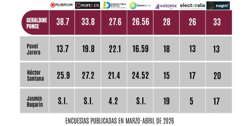 Los resultados son consistentes a lo largo de todas las mediciones: Rubrum le otorga 38.7%, Populus 33.8%, Insightt 33%, Voto MX 28%, Demoscopia Digital 27.6%, Electoralia 26% y Demotáctica 26.56%. En las siete encuestas, Geraldine Ponce aparece en primer lugar.