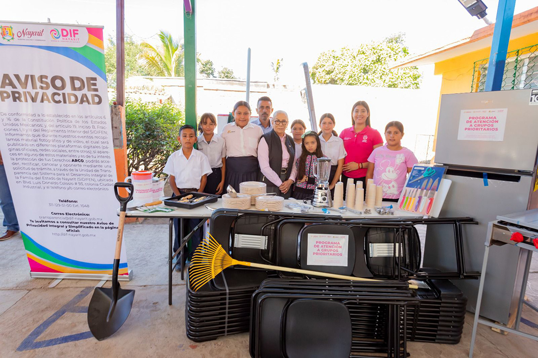 Entre el equipo entregado se encuentran tablones, sillas, refrigerador, platos, vasos y otros utensilios de cocina; también fueron beneficiados el preescolar Rey Nayar, la primaria Lázaro Cárdenas del Río y la telesecundaria Jaime Torres Bodet, mientras que las y los estudiantes de la escuela primaria Miguel Hidalgo recibieron insumos como semillas y herramientas de jardinería para que desarrollen habilidades y conocimientos sobre el cultivo de alimentos, a través de un huerto escolar.