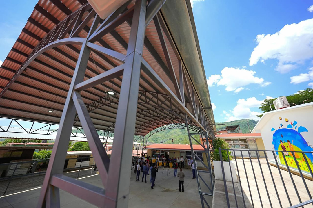 Vino a beneficiar mucho este domo, esta techumbre para todos los niños de esta escuela. Estamos muy agradecidos aquí con el gobernador. Se comprometió a darnos aires acondicionados, una biblioteca, a ver la probabilidad de ampliar el terreno. Entonces estamos muy agradecidos.