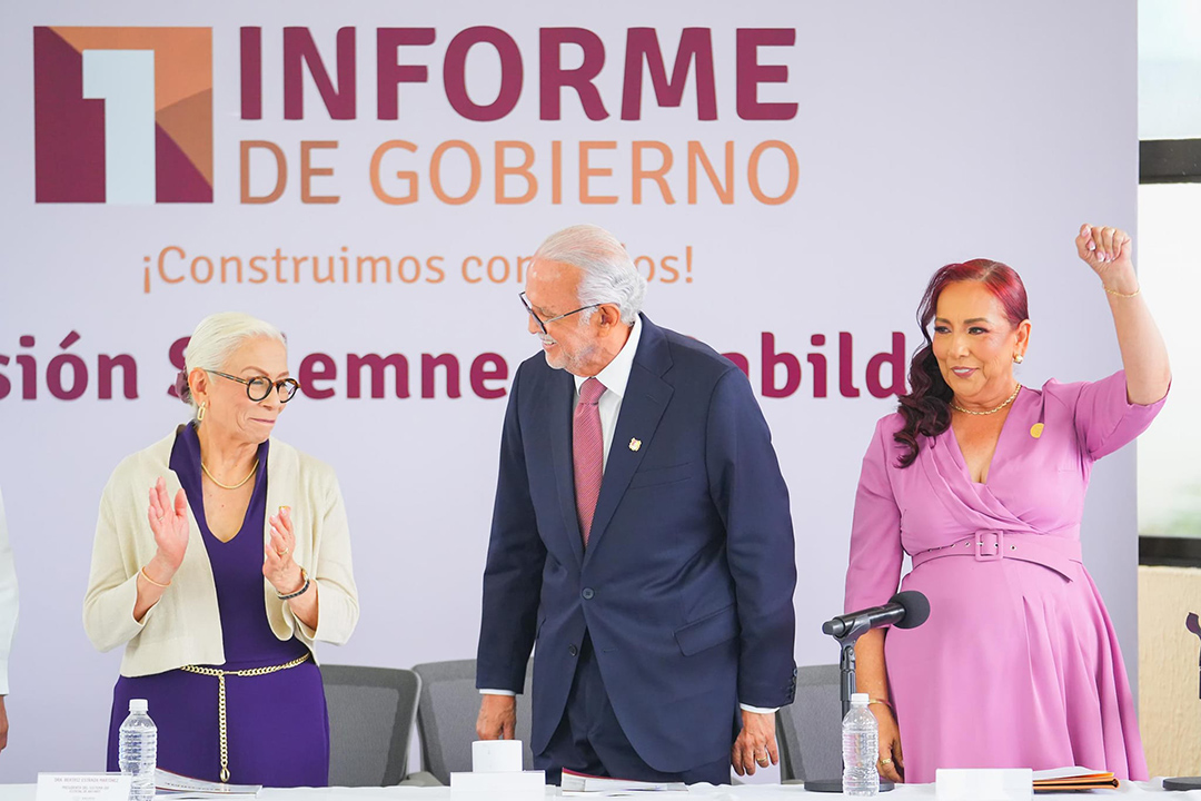 El gobernador del estado, Miguel Ángel Navarro Quintero, junto a su esposa, la presidenta del Sistema DIF Nayarit, doctora Beatriz Estrada Martínez, asistió este lunes en el municipio de Xalisco a la Sesión Solemne de Cabildo, en la que la presidenta municipal, Anabel Margarita Guerrero Benítez, rindió su Primer Informe de Gobierno.