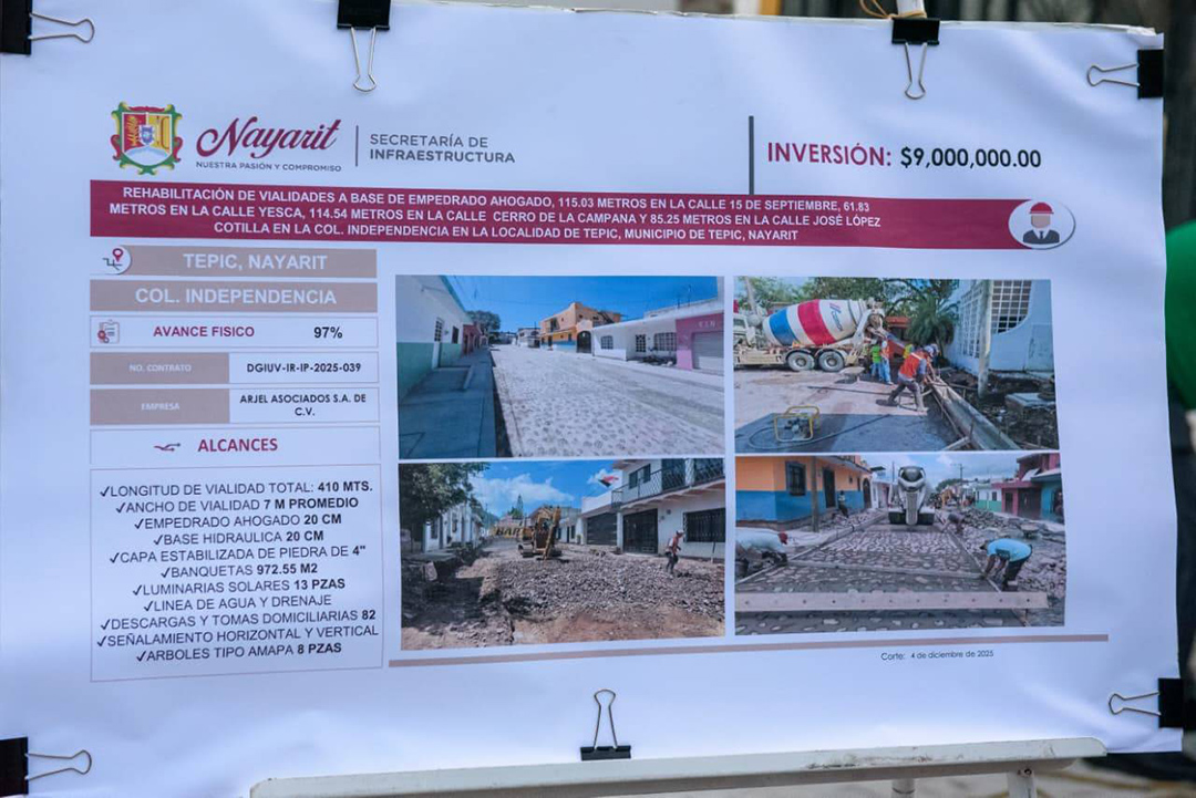 El gobernador del estado, Miguel Ángel Navarro Quintero, realizó una visita de supervisión a los trabajos de rehabilitación de vialidades que se desarrollan en las calles La Yesca y José López Cotilla, de la colonia Independencia de la capital nayarita.