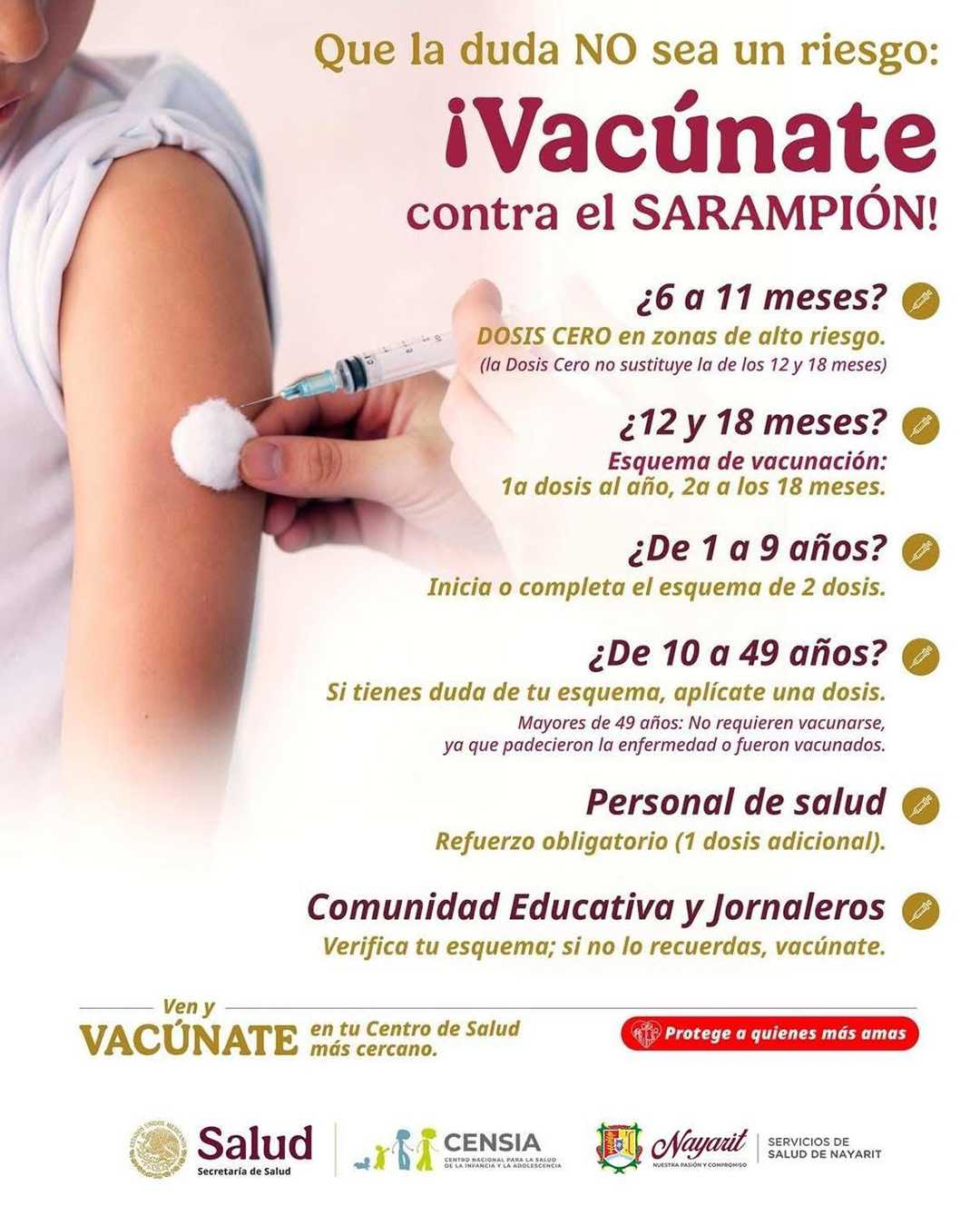 **El sarampión es una enfermedad altamente contagiosa, pero prevenible mediante la vacunación. El Gobierno del Estado de Nayarit exhorta a la población a revisar su esquema de vacunación de acuerdo con la edad y a proteger la salud de niñas, niños, jóvenes y personas adultas.