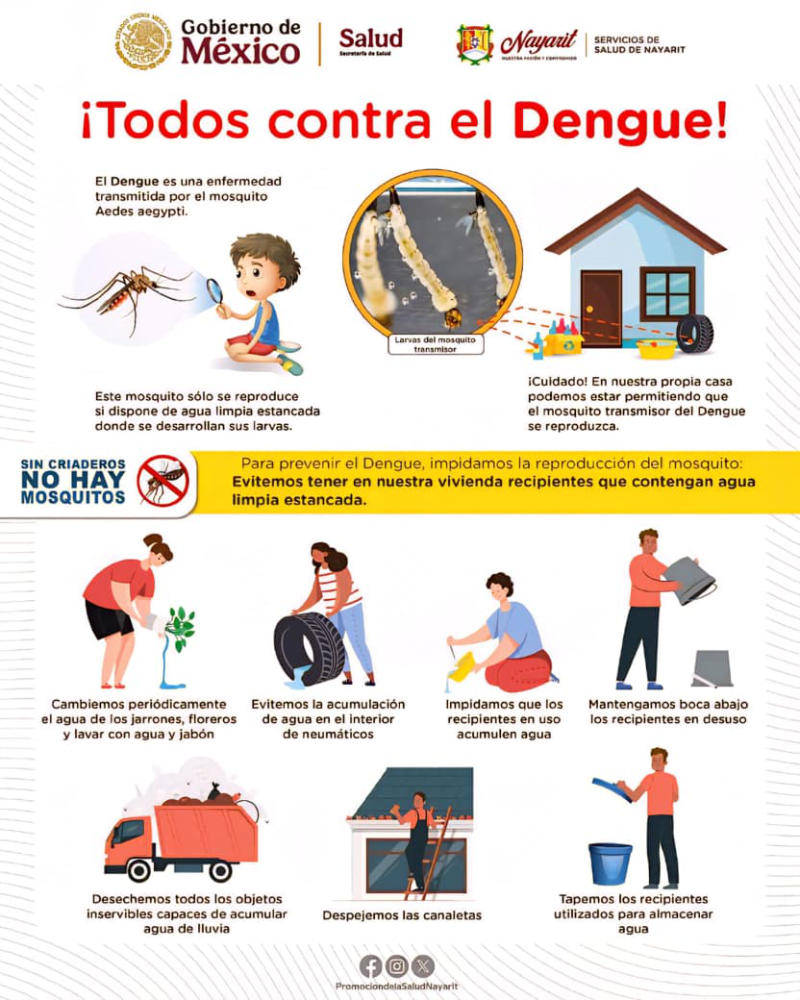 **El Gobierno del Estado, a través de los Servicios de Salud de Nayarit, hace un llamado a la población a revisar patios, azoteas y espacios del hogar donde puedan acumularse recipientes con agua.