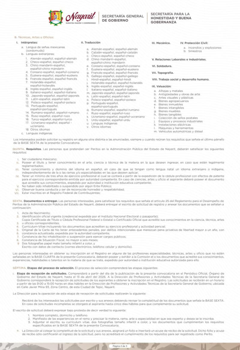 Si cuentas con experiencia en alguna ciencia, arte, oficio o profesión, esta es tu oportunidad de formar parte de la lista de personas que podrán fungir como Peritos de la Administración Pública del Estado de Nayarit para el periodo 2026–2030.