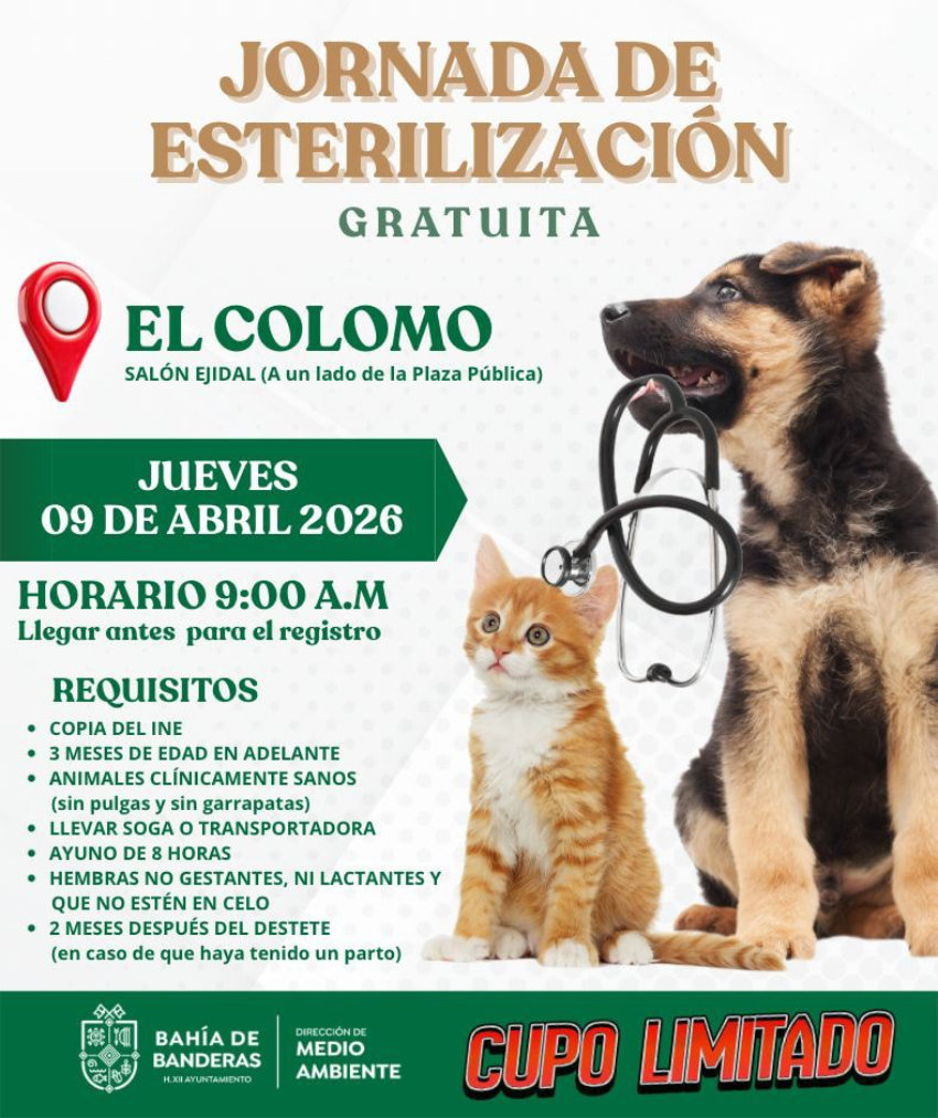 El Gobierno Municipal de Bahía de Banderas, a través de la Dirección de Medio Ambiente, realizará una nueva jornada gratuita de esterilización para perros y gatos, este próximo jueves 9 de abril, esto en el salón ejidal de El Colomo qué se ubica a un costado de la plaza pública.