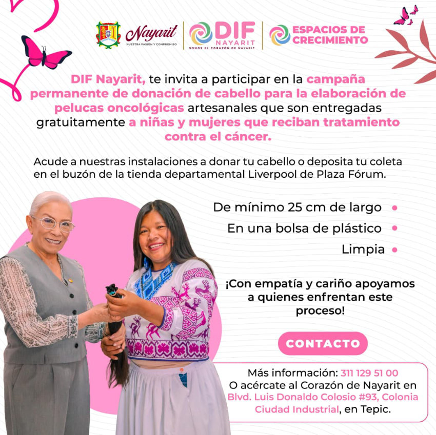BEATRIZ ESTRADA Y EL CORAZÓN DE NAYARIT TE INVITAN A DONAR ESPERANZA A TRAVÉS DE LA CAMPAÑA PERMANENTE DE DONACIÓN DE CABELLO, DESTINADA A LA ELABORACIÓN Y ENTREGA DE PELUCAS ONCOLÓGICAS PARA QUIENES ENFRENTAN CON VALENTÍA LA LUCHA CONTRA EL CÁNCER