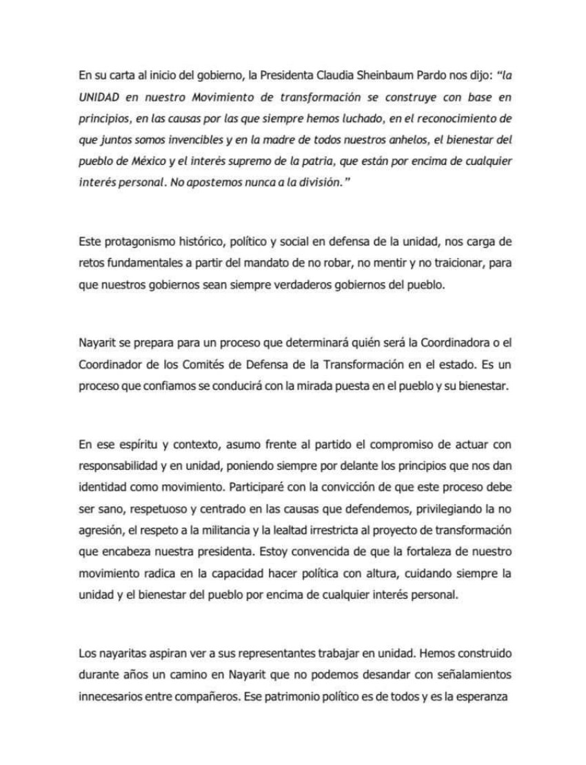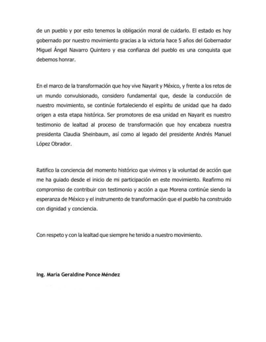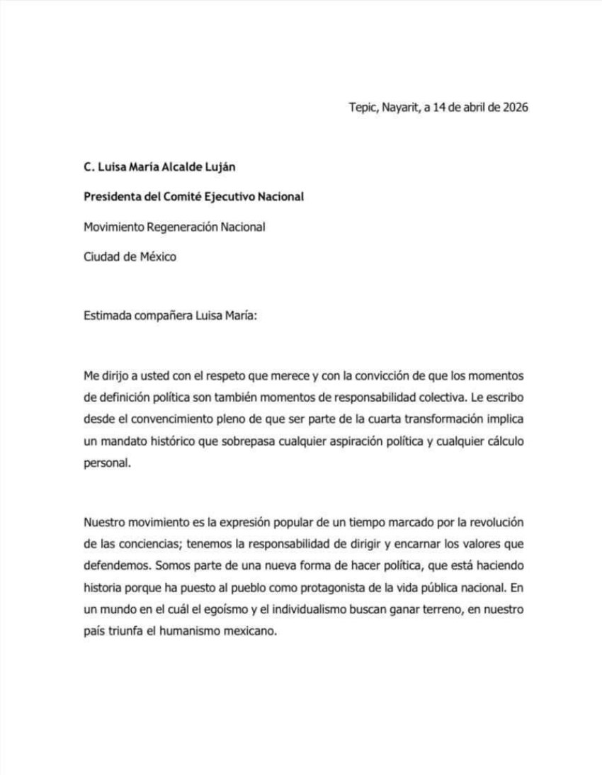 En una semana en la que circularon rumores dirigidos a debilitar el rol de la dirigencia nacional. Geraldine Ponce, aspirante principal de Morena en el estado, reconoció el liderazgo de Alcalde mediante una carta centrada en el papel del movimiento en Nayarit, en México y en el contexto internacional.